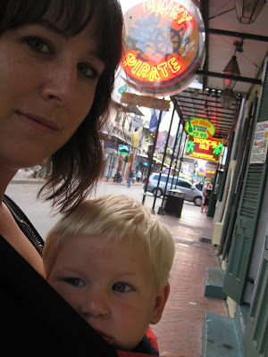 Then we headed to Bourbon Street. I had really wanted to bring the stroller to the French Quarter. I knew we would be walking a lot, and I thought it would make life easier. Mark vetoed my idea, and we left it at home. So I carried Sawyer in the carrier while Mark switched off convincing Judah to walk, carrying him, and giving him piggy back rides. I missed the stroller, But Beans loved it. He spent most of the time on the verge of falling asleep.
